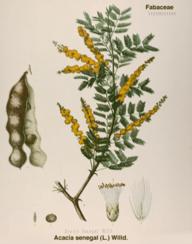 When the rainy season ends the trunk of the acacia begins to ooze sap, or gum. This gum is collected from December to June and is used to make gum Arabic. Gum Arabic is used in making medicine. It is used to make a cream for skin inflammations and ailments of the respiratory and urinary tracts. Its also used for coughs, sore throats, eyewash, diarrhea, and dysentery. It is also used as flavoring in certain soda (pop). The acacia provides shade and shelter for the animals of the savanna. Giraffes, antelopes and elephants eat its leaves, and birds make their nests in its branches and use them as perches to look out over the flat grasslands. Acacia was considered sacred by the ancient Hebrew. It is said that Moses used acacia wood to build the Ark of the Covenant and the sacred Tabernacle (Exodus, chapters 25-40). Legend also has it that the thorns of the acacia were used for Christ's crown of thorns.