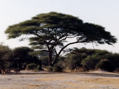 although at night the temperature can go The Umbrella Thorn grows up to 20 meters high and has a spreading, flat-topped crown that gives it its name. The bark on the Acacia is black to gray in color and feels rough. The branches on the Acacia are gnarled. The Umbrella Thorn has two types of thorns on the branches; long, straight, brownish thorns and shorter, hooked thorns that grow alongside each other. The thorns grow in pairs and disguise themselves in the clusters of flowers that grow on the Acacia. The flower clusters have up to 400 white, puffball flowers that grow on a twig on the Acacia. The Acacia's leaves are composed of small alternate leaflets on a central rib. The acacia's leaves are 2.5 cm long and 1 mm wide. The seeds are 8 to 12 cm long twisted pods. The Acacia's belong to the family "Mimosaceae", and until recently was known as the " Mimosa Tree". One of the Umbrella Thorn's adaptations to hot and dry conditions is a deep taproot, which can reach 115 ft under the ground. This adaptation helps it get the water during the dry spells. A second set of roots spread out just under the ground about twice the area of the crown. The little leaves of the Umbrella Thorn prevent water loss. The acacia's umbrella-shaped tops enable the tree to capture large amounts of sunlight with the smallest possible leaves. The thorns are used to keep the savanna animals away from eating the leaves, flowers, and seedpods. The only animal that is immune to the thorns is the giraffe. The Acacia provides shade for the animals of the savanna. The trunk of the tree makes very good charcoal and firewood. The flowers on the Acacia provide a good source of honey in some regions. The stem of the tree is used to treat asthma, and diarrhea. The bark of the acacia is used as a disinfectant, and the pods are used to make porridge. The Acacia is not endangered, and it is actually plentiful. There are over 700 species of the Acacia in Africa. by Patricia N. 2002