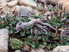 15-35 Salix arctica is 15-20 cm in height. It has many different shapes, but sometimes has long trailing branches that root where they touch the surface. Rock willows/Arctic willows grow prostrate, shrub, and carpet. The leaves are oval shaped with pointed tips, wedge shaped bottoms, and have little stalks. These leaves are 15-50 mm in length. The leaves are dark green on the bottom and a lighter green on the top. They have net like veins and long hairs that cover their leaves. The flowers of the Salix arctica are upright scaly spikes that are unisexual flowers with no petals. The Salix arctica blooms in the spring. They are 5 cm and are dark brown or sparkling pink. There's no fruit on the plant, only seeds. There are no taproots on this plant. The lateral roots are shallow due to the frozen ground underneath the permafrost. Salix arctica has made many adaptations to the cold climate of the North American tundra. In its strongest growth season the Salix arctica forms a pesticide to keep insects like the Arctic woolly bear away. It has also adapted to the permafrost by growing a shallow root system. The leaves of the Salix arctica have also adapted to the cold weather by growing long fuzzy hairs. The Salix arctica is very plentiful in the wild, but is still vulnerable because of the delicate habitat it lives in. It has a shallow root depth, which makes them susceptible to root damage. It also has a short growing season. There is also a limited food supply for herbivorous insects. There is also a low N.P.P. (nitrogen/ phosphorus/ potassium) in the North American tundra. This means that the chemical fertility of the soil is low. There are many studies being done on the Salix arctica. Some of the organizations involved are I.T.E.X. (International Tundra Experiment), S.A.G.E. (Sustainable Arid Grassland Ecosystems). International Tundra Experiment placed open top chambers (O.T.C) in order to raise the average temperature a couple of degrees to find out how it affected the plants, insects, etc. Sustainable Arid Grassland Ecosystems studied the arctic grasslands and plants. The Tundra is a delicate place where tire tracks can last for years. The Salix arctica has adapted well in these frigid non-fertile conditions. In such conditions small changes could drastically affect the Salix arctica. By Loren G. 2003