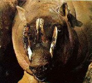 Sulawesi, The name babirusa in Malay means "pig deer". It got this name from its bizarre tusks. The upper canines actually grow up through the skin of it snout from the inside. These 12 inch long tusks then grow up and curl over towards the forehead, sometimes touching the snout again. The lower canines are also very long and protrude from the sides. The two sets of tusks give the appearance of the antlers of a deer. Only the bottom tusks are used offensively. The top tusks can't be used for foraging or as weapons because they are very fragile and lose in their sockets. Females have shorter tusks, or none at all. Babirusa are smaller than domestic pigs. They are 2.8-3.6 feet in length, and 2.1-2.6 feet at shoulder height. The tail is 8-12 inches long and not twisted. Babirusas weigh from 95-220 pounds. This curly-tusked pig has a rounded body with almost hairless, bristly skin. The sparse hairs are yellowish in color. Their skin is gray to brown, with a lighter colored underbelly. Their legs are thin and longer than on most pigs. Mature babirusas have large folds near their necks and bellies. Babirusa reach sexual maturity from 1 to 2 years. After mating the pregnancey lasts 150 to 157 days. The babirusa only gives birth to 1 to 3 young at a time, unlike other pigs who will have 7 to 9 piglets. The mother babirusa will lie down to nurse her piglets. Although the young will begin to forage within the first week after birth, they aren't weaned until they are 6 to 8 months old. The babirusa has a life span of 24 years. The babirusa is usually a solitary animal, although it will sometimes live in small groups. Its habits are duirnal, and it tends to feed in the morning. Its diet consists of fruits, nuts, mangos, mushrooms, leaves, and insects found in rotting wood. Unlike other pigs it doesn't root around the dirt for food with its snout. It moves along well-worn trails along the rainforest floor within their territories. It is a fast runner and a good swimmer, and has been seen swimming to off-shore islands. It has a good sense of smell and makes grunting and moaning sounds. When it gets excited it chatters its teeth. Like most other pigs it loves to wallow in mud baths to rid itself of parasites. In the past babirusa were kept by rulers in Sulawesi and given as gifts to visiting diplomats. Masks of Balinese demons often resemble the stangely tusked babirusa. Unfortunately the future doesn't look good for this amazing creature. They have always been scarce, but are an endangered species today. Although the babirusa avoids farmlands, and isn't persucuted by farmers, it is a favorite target for poachers. Their limited and small pockets of rainforests are also being converted into agriculture. Their wild population is estimated at around 4,000 to 5,000 animals. The IUCN put them on their vulnerable list in 1996, and the U.S. ESA considers them endangered They are on CITES Appendix I.