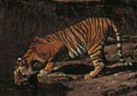 tiger is very sneaky The Bengal tiger lives in the Sundarban regions of India, Bangladesh, China, Siberia, and Indonesia. The tiger reaches maturity at the age of five, and the life span of the tiger is about 15 years. The Bengal tiger mates about any time of year. The Bengal tiger can have a litter of up to four cubs. The cubs don't hunt for themselves until they are at least 18 months old. Then they go hunting with their mother. The gestation period is about three months and ten days. The Bengal tiger is a carnivore. It eats boars, wild oxen, monkeys, and other animals. The Bengal tiger can catch big animals, but prefers killing either young or old animals because they don't run as fast. The Bengal tiger is a nocturnal and greatly feared predator. It eats wild oxen and other animals, which eat plants , which are part of the food web. So it helps balance the web. In the year 1900 there were 50,000 tigers on the earth, but now there is only 4,000 left in the world. So you can see that the population has decreased because of poachers and other cruel and selfish people. The Bengal tiger is protected in many places such as: The Nagarahole National Park 250 guards, and The Ranthambhore National Park 60 guards. The guards in the national parks are important because they know the kind of tools and weapons poachers use, so the guards can identify poachers. In India the Indian government made an effort to save the tigers. It was called "Project Tiger", and it was thought up in 1972 from Prime Minister Indira Gandhi. Under this protection from the government, hunting and trading tiger parts were banned. A sad thing happened 8 years ago when 850 pounds of tiger bones, which adds up to about 42 tigers were found in New Delhi, India hunted by poachers. The reason why poachers and other people hunt beautiful animals like tigers is because the eyes, bones, and even whiskers are very valuable to researchers who are making medicine to treat or cure human ailment, and to give people a longer life. Babette B. 2001
