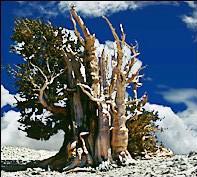 harsh environment, free of competition from other plants and the ravages of insects and disease. The oldest bristlecones usually grow at elevations of 10,000 to 11,000 feet. The oldest known tree is "Methuselah", which is 4,789 years old. To keep Methuselah from harm, this tree isn't labeled, as the other trees are. An older tree called Prometheus was killed shortly after it was discovered in 1964. This happened when a geologist searching for evidence of Ice Age glaciers was taking some core samples from several bristlecones. Just as he realized he had found a tree over 4,000 years old, his coring tool broke. Amazingly the U.S. Forest Service gave him permission to cut down the tree. Prometheus turned out to be 4,950 years old. It was a 300 year old tree when the pyramids were being built in Egypt. After people heard about this incident, the U.S. Forest Service tightened security around the bristlecones. The bristlecone pine is a multi-trunked tree, gnarled and twisted by the elements. Much of the pine is dead wood. Wind whipped sand and ice scour the dead wood smooth and beautiful. As a survival strategy much of the bark and tissue that conduct water dies back after the tree is damaged by fire, drought or storms. This reduces the nutrients the tree has to supply to tissue and balances the result of the damage. The remaining parts are very healthy. A 10 inch strip of bark can sustain a large crown. This bark is red-brown in color and grooved with thick, irregular ridges. The crown of the bristlecone pine is rounded. The branches and needles look somewhat like a bottle brush because of the closely spaced needle whorls. The needles are deep yellow-green, with blunt ends. They come in bundles of 5, and are 1 to 1.5 inches in length. Because the needles can live twenty to thirty years, the tree doesn't need to expend much energy on adding new needles. This helps the tree survive through years of stress. The male