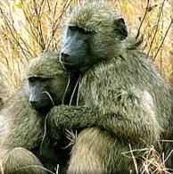 in. long Unlike what you would expect, baboons do not live in trees. They spend most of their time on the ground. The only time they go into trees is to escape predators, get food, or spend the night. They might also spend the night on tall rocky outcroppings. Baboon babies go up in trees to horse around and play with each other. Baboons mostly eat fruit from trees, roots, an assortment of plants, and of course, bugs. Baboons live in groups known as troops. Each troop consists of a dominant male and female, and other adult males and females and offspring. When they travel they have their own specific formation. The dominant male is in the front and the dominant female is behind him. The other males form a circle with the rest of the females and the offspring in the center. Baboons have a very complicated social system which is really just based on becoming and staying dominant. Couples will often stay together to raise an infant and males will even become a foster parent if the mother is killed. Infants will start riding jockey-style when they are about 6 weeks old. By the time they are 4 months old they are climbing trees. They depend on their mother's protection and guidance for about a year. The baboons are unique in that all the members in the troop or family are related in some way. Baboons can live to be 45 years old. The baboon have cheek pouches in which they can store food. They can also rely on others in the group or family for food and water. Everybody helps to find food and water in the family. Baboons can run up to 35-40 miles per hour. They also have very sharp teeth which they use for defense if they get into a scrap with a predator. Their main predator is the leopard, but it avoids large males who will gang up on it and sometimes the leopard gets badly injured. Baboons inadvertently feed other creatures by dropping or leaving food behind when they eat. Other creatures scavenge the leftovers. When a predator catches and kills a baboon, it provides food for that predator and its family and scavengers. Baboons are duirnal and are always on the move so they don't strip an environment of it vegetation. Like the lion, the baboon is also endangered, and like the lion we need to try and save it. So please do whatever you can to help save these wonderful creatures of the African savanna. by Chase S. 2000.