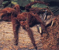 one eating a humming bird. Like most tarantulas, the Goliath-bird eater is a deep burrowing species. They live in burrows in the ground dug by the spiders themselves, or abandoned by rodents. The female spends most of her life in her silk-lined burrow. They are nocturnal spiders and don't travel more than a few feet from home, resting in their burrows during the day. The Goliath bird-eating spider is a solitary arachnid, and only associates with other spiders of its species when mating or guarding its young. Males can be identified by the mating hooks on the first set of legs. The male will come to the entrance of the female's burrow and try to entice her out. He will use his mating hooks when she comes out to restrain her fangs while he tries to mate with her. Afterwards he has to make a fast getaway or be injured or killed by the female. About 50% of the males are killed or maimed while trying to mate. The female deposits about 50 eggs in a silken egg sack about 1 inch (3 cm) in diameter, and stores it in her burrow. She guards it for 6 to 7 weeks, even taking the sack with her when she leaves the burrow. After the young spiders hatch they stay in the nest until their first molt, and then go out on their own. The Goliath bird-eating spiders are considered to be very aggressive and do not make good pets. Unlike other spiders, who are noiseless, the Goliath bird-eating spider can make a hissing noise to frighten off threats by rubbing bristles on its legs together. They will also rear up on their hind legs in a threat position. Their two fangs have poison glands at their base. Although they are not very toxic to humans, they can cause severe pain, nausea and sweating. The venom works on the nervous system and paralyzes its smaller victims. A more painful way of defending itself is to flick off the hairs on its abdomen with its legs. These microscopically barbed hairs can be irritating to the skin and lungs. They will cause swelling for a few hours like a nettle rash. It is most serious when the hairs get into your eyes or mouth. The life expectancy for a female Goliath bird eater is about 25 years. Most require about 10 years to mature to adults. Males live for only one year or less after mating. The spiders continue to molt after reaching maturity and are able to regrow any limbs they might lose. The size and power of the Goliath bird-eater makes it possible for them to eat larger prey. They rarely eat birds, although they may eat hatchlings. Its usual diet consists of frogs, small snakes, beetles, insects, lizards and even bats and pinky rats. They don't have any special hunting technique, like building webs or leaping on their prey. They will sneak up on their prey and pounce on their victim, injecting them with venom which paralyzes them. They will often carry their prey back to their burrow or a safe location to eat it at leisure. They don't have teeth to tear or chew their food, but regurgitate digestive juices onto their victim. The juices break down the soft tissue making it possible for the spider to suck up the liquid and eat its meal. Although it is not threatened in the wild, it does have natural enemies like certain spider wasps, some snakes, and other tarantulas. The spiders are most vulnerable during molting when they are fragile and can't move very well. Smaller insects can easily kill a tarantula in the process of molting. It takes several days for the exoskeleton to harden again. The most dangerous enemy the spider has is man and the destruction of its habitat. 2003