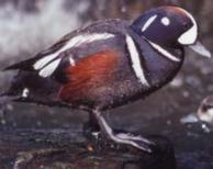The The harlequin duck reaches sexual maturity at two years old. It breeds during May-August. The female duck lays anywhere from 5 to 7 yellowish colored eggs. She sits on the eggs for 27 to 29 days and covers the eggs with down, when she's away from the nest. The chicks hatch within a few hours of one another and are able to swim and feed soon after they are hatched. The ducks like to nests by fast flowing rivers, by the edge of the water. Their nests are well hidden and are made from a hollow lined with grass and down. Young chicks fledge (get their feathers) after 35-42 days. The male duck stays with the female until she is finished incubating. They live in flocks of up to 50 in the Atlantic and in larger groups in the Pacific, except when breeding. They are sociable birds. They don't often mix with ducks of other species. Feathers keep the ducks warm and allows them to fly. Feathers are not living so they don't need blood vessels, nerves and other living tissue. They are made of a tough, flexible material and called keratin. There are six different kinds of feathers, such as contour, down, afterfeathers, filoplumes and bristle. The harlequin duck does not have feathers on its beak or feet. The ducks have an oil gland near base of their tail. They use their beak or tail to spread this oil through their feathers to make them waterproof and shiny. When feathers get hurt they do not heal. Ducks molt (loose old feathers and grow new) about 3 times a years. Molting can take up to two months. Harlequin ducks loose all their feathers at once. During breeding, the female duck looses most of her feathers on the lower breast, exposing the skin where it touches the eggs during incubation. The heat from her body helps keep the eggs warm. Feathers help the birds to fly and they also give the wing a shape. A harlequin ducks diet consists of mussels, shellfish, aquatic insects, crustaceans and some small fish. They feed in tight- packed flocks and drive into water 3 or 4 meters deep and within 15 to 25 seconds of diving they have their prey. During the summer months they he at insect larvae found in shallower waters. The harlequin duck is a prey to the arctic fox and to the gray wolf. Harlequin duck are not an endangered species. Their lifespan is unknown . by Travis T. 2001