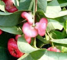 average The leathery leaves grow opposite each other on short, thick stems that clasp the twig. They are oblong in shape, narrower at the stem end. They are 2 to 10 inches long, 1 to 6 inches wide. They are pink when young and become dull, light-green above and yellowish-green beneath when mature. The flowers have a faint fragrance and grow in loose clusters of 3 to 7 at the end of branches. The petals are pale yellow, yellow-white or pink and the stamens are uni-colored. In Indonesia the tree blooms twice a year, in July and again in September. The fruits ripen in August and November. The jambu fruit has a shiny, thin skin which varies from white to light red. About 1 inch long and 1-1.5 inches wide, they are shaped somewhat like a pear with a narrow neck and a wide apex. The fruit curves in and forms a concave indentation from which stiff sepals and the style protrude. The flesh is white or pink, slightly fragrant, crisp and juicy with a faint sweet flavor. The fruit has about 1-3 seeds which, together with the roots, are considered poisonous. Red and white jambu are found in Indonesia. The red jambus are the smallest fruit, sweet and juicy, with the white ones being very acidic. In Malasia there is a wide variety of color, ranging from palest green, delicate blush pink to deep crimson and a sort of brownish red. Green jambu are very crunchy but not as juicy. Southeast Asian rainforest animals, like monkeys, gibbons and jambu fruit doves rely on jambu as part of their diet. Growing wild, the jambu is also cultivated throughout Southeast Asia and is not endangered. Elisabeth Benders-Hyde
