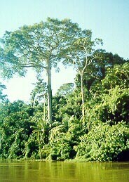 a The crown has an open umbrella shape. Many plants and animals grow and live in the branches of the kapok tree. Birds nest in it, and mammals use the huge branches as highways. Frogs breed in the pools of water that collect in the bromeliads. Kapoks are drought deciduous. This means they shed most or all of their leaves during the tropical dry season. The dry season occurs during the northern hemisphere winter. The leaves are palmate and compound. The 5-9 leaflets are 7-8 cm long and 1-3.5 cm wide. Flowers usually open before the leaves appear, and are clustered on small, new branches. The 5 petals of a flower are about 2.5 cm long and are a creamy white or pale pink in color. Their odor is unpleasan, but is probably meant to attract the bats that pollinate them. The brown seeds are round like peas and are found in pods. The pods are woody, smooth and pendulous, with a light green color. They will burst open while still on the tree after the leaves have fallen. Inside a whitish cotton like fiber surrounds the brown seeds. These are born away on the wind. Most emergent trees will have wind borne seeds because they rise above the stagnant air of the rainforest and can take advantage of the breezes which blow there. Fruit bearing plants close to the forest floor rely on animals to eat and disperse their seeds, which will fall to the ground when ripe, and which are normally covered with a thick, appetizing pulp. In many places the straight trunks of the kapok tree are used to make dugout canoes. The white, fluffy seed covering is used in pillows and mattresses. Since it is buoyant and water resistant it is often used in flotation devices and padding. The seeds, leaves, bark and resin have been used to treat dysentery, fever, asthma, and kidney disease. In Mayan myths the kapok tree was sacred. They believed that the souls of the dead would climb up into the branches which reached into heaven. The kapok tree is widely spread around the world and occupies an important niche in the ecosystem of a rainforest. Emergent trees like the kapok rise above the canopy of the rainforest and provide a home for plants dependent on sunlight. Their branches provide a habitat for countless epiphytes, which provide food and shelter for many types or animals. They allow animals to move around the rainforest without coming down to the ground. Monkeys who venture out to the tops of emergent trees are easy prey for eagles. There is no status on the kapok tree. Its timber is desirable because of the great length of its trunks, the beautiful color of its wood, and its straight grain. People of the rainforest have many uses for the kapok tree. As with many desirable things, too many people may want to exploit the kapok tree and put its future in jeopardy.