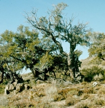 It dwarfs because of severe drought, The Navahos use the twigs with their white flowers as prayer sticks. The handles of Navaho distaffs are made of this wood probably because it does not splinter easily. It is hard so the Navahos make dice from it. The Mountain Mahogany is not endangered. In fact it covers large areas. It can be found in Oregon, Baja California, the Channel Islands, South Dakota, Utah, Texas, Oklahoma, Arizona, and Mexico. by Phil Z. 2002