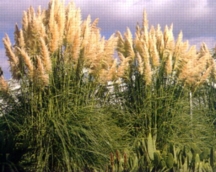 stream bank or in a shallow moist Pampas Grass can grow to an impressive size for grass, about 8-12 feet tall. Its leaves are only .5 inches to .75 inches wide but can be 10 feet long. It grows in large clumps called tussocks. Each tussock is about 12 feet tall with many plants in it. The leaves are razor sharp and could slice you open just by rubbing against them. The leaves are a deep green color. The Pampas Grass has large pink plume like flowers that give the grass an ornamental sort of look. It also has oval shaped seeds growing off of it, which are .25 inches long. Its seed has a tan crusty shell. The female plants are prettier and their flowers are fuller. Pampas Grass can adapt to most places and can adapt fairly quickly. This quick adaptation is the product of a deep root system that digs down and finds water so it can survive in the driest areas. Pampas Grass is used in many ways. A common use is as a hedge because of the razor sharp leaves and stiff stems. It is used mainly as a decoration. Pampas Grass makes a nice ornamental plant because of its large plume-like flowers. The only setback to having it as an ornament is the sharp leaves because just brushing against it can give you a cut that becomes inflamed. Many people put this plant in garden beds or on lawns. It is not farmed for any purpose because there is no value in it for farmers. The Pampas Grass is not an endangered plant. These plants are very common in the South American Pampas. This plant has an incredible seed output. Each plant puts out over 1 million seeds in its life time. This large seed output results in Pampas Grass being a very prolific plant. California has listed them as an invasive weed that pushes out native plants. They are banned in New Zealand and Hawaii and are on their noxious weed list. by Augie W. 2002