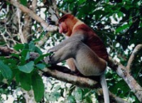 and avoid human settlements. The proboscis monkey gets its name from its large, fleshy nose. Both males and females have the large noses. Female noses are not as large, although larger than most monkeys, and juveniles have small upturned noses. The male's are so large that they hang down over their mouths, reminding one of the old comic, Jimmy Durante. Sometimes they have to push it out of the way before putting something in their mouth. Their noses swell and turn red when they become excited or angry. They also make loud honking sounds as a warning when they sense danger, which make their noses stand out straight. The nose acts as a resonator when the monkey vocalizes. Another obvious characteristic of proboscis monkeys are their large pot bellies. Proboscis monkeys are colobine monkeys and they have a unique digestive system that allows them to use leaves as their main food supply. Twice as large as any other colobine monkey, their stomachs are divided into compartments and filled with cellulose digesting bacteria. The bacteria help digest the leaves and neutralize toxins in the certain leaves. Their stomach contents make up one quarter of their body weight, and make them look permanently pregnant. Their ability to eat mainly leaves gives them a niche where they are the only medium sized mammal living in the canopy of the forest. They have reddish-brown fur on their back and shoulders, which ends at midsection . Their chests are creamy, with a creamy collar running around their neck and around their waist to their buttocks and tail. Their arms and legs have long, gray gloves and stockings. Orange fur covers their shoulders and a cap of darker red fur covers their head. Their faces are flesh colored with small, intelligent brown eyes. Their ears are small and lie flat against their heads. The male proboscis monkey is much larger and heavier than the female. A male is 2 to 2.5 feet (66-72 cm) long, and weighs 35-51 lbs. (16-23 kgs), while a female is 1.7 to 2 feet (53-61 cm) long and weighs only (15-24 lbs.) 7-11 kgs. Their tails are as long as their body. Troops of proboscis monkey average in size from 12 to 27 individuals but can be as big as 60 to 80 males and females. The groups don't appear to have a lot of structure. Both males and females will move out of their natal group Their social system has two levels. One is the all-male groups. These are made up of juveniles, adolescents and adult males. Juvenile males will leave the group they were born to at about 18 months, and join an all-male group. There is very little aggression between the males when they join together to form troops. The second level is made up of several groups which are led by separate males. Each male will have his own harem and several of these harems will come together to form a troop. Females may transfer from one harem to another when young, but the harems are mostly stable. Proboscis monkeys are not a territorial species and a group's range will overlap that of many other groups. Adult females tend to coordinate troop movement and lead groups when feeding. One of the dominant males will keep a look out in a tall tree while the group feeds. Proboscis monkeys are dependent on habitats that adjoin rivers, and usually don't move farther than 1,969 feet (600 m) from a river or stream. They sleep in trees, preferring thick branches growing over water, to protect themselves from predators. Proboscis monkeys are excellent swimmers, but only swim only when necessary, as when crossing rivers. They will cross at its narrowest point doing the dog paddle. Many will cross at the same time for protection from predators like crocodiles. They will quietly slip into the water and swim silently without splashing so as not to attract attention to themselves. In times of danger, the whole troop may jump into the water as a means of escape. Partially webbed feet help the proboscis monkey swim and distribute its weight when walking on the soft mangrove mud. Proboscis monkeys swing through the trees and leap from branch to branch using all four limbs, moving slowly because of their weight. Usually feeding in the early morning, they will rest the whole day. Then will feed again just before nightfall. The greatest times of activity is from late afternoon until dark. Ninty five percent of their diet is leaves of the mangrove and pedada trees. They prefer immature leaves over older ones They will also eat fruits and seeds Proboscis monkeys give birth to one baby at a time. Their gestation period is about 166 days. They will usually give birth at night The newborn has a deep blue face and sparse, almost black fur. The color changes to its adult colors at about 3-4 months. Females will help look after each others infants and sometimes eve suckle other babies. The young will stay close to their mother for about one year, or until she has another infant. Males will reach sexual maturity in about 4-5 years and females in 4 years. Their life span is about 20 years. The proboscis monkey's main predators are man and the clouded leopard. The proboscis monkeys were once protected by its mangrove habitat, which was unhabitable for people. Now technology has made it possible to clear-cut the mangroves and fill them in. Logging has caused loss of the proboscis monkey's habitat and their population is going down. In 1977 it was estimated that 6,400 proboscis monkeys remained in the wild in the province of Sarawak. It is now estimated that only 1,000 remain. About 2,000 remain in the province of Sabah and 4,000 in Kalimantan. It is listed as endangered by the USDI and Appendix 1 of CITES. Appendix I lists species that are the most endangered among CITES-listed animals and plants. These are threatened with extinction, and commercial international trade of these species is generally prohibited. Attempts to keep proboscis monkeys in captivity have not been successful. The only place to see these monkeys are in their natural habitat, the rapidly disapp
