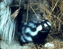 hollow tree. All skunks can spray their predators. They have 2 anal glands that are filled with musk. When a skunk sprays, it squeezes the anal glands together and the musk comes out an anal opening. However, there is a process the skunk goes through before spraying its enemy. The skunk first gives a warning by stamping its front paws. If the intruder pays no heed, the spotted skunk then stands stiff and struts around. It then stands on its front paws and waves its rear end in the air. After that, the skunk sprays its enemy. The musk can linger on the same spot for days. Most animals take the hint and stay away from the skunk after they've been sprayed once. Also, skunks can swim, but they swim only when their life is threatened. The western spotted skunk mates in October and gives birth in March or April the following year. However, both sets of birth times vary due to the fact that female skunks can delay the birth date until the food is plentiful. Mother skunks give birth to about 6 pups at a time. A skunk's gestation period is 50-65 days, longer with implantation. They reach sexual maturity at 4-5 months. Their birth interval is 2 years. For the first 8 weeks baby skunks feed off their mother's milk. After they have been weaned, the mother brings her young live prey, and eventually teaches them to hunt for themselves. A pup's father does not play a huge role in its life cycle, staying solitary in the summer, and occasionally sleeping with the mother and pups in the winter. Skunks do not truly hibernate. The pups have musk glands when they are 1 month old. They reach full size at 4 months. Skunks live up to 10 years in captivity. A normal spotted skunk's diet in the winter consists of mainly rats and other rodents. However, in the summer, the skunk's diet changes to more vegetation and insects. The skunks normally eat small mammals along with these. In the autumn, a skunk adds fruit and berries to its diet. In the winter, the skunk goes back to its original favorite prey, small mammals. The spotted skunk's prey is mainly small mammals such as rats and mice. The spotted skunk has no normal predators as it shoots its musk to defend itself. However, great horned owls and bobcats have been known to attack them. Skunks are especially helpful to humans by catching rodents quite frequently. Spotted skunks are common animals and are not considered endangered. Spotted skunks are plentiful, occupying most of their habitat pretty densely. by Will O. 2002