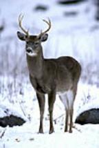 any time. They will feed mostly just After mating, which lasts from October to December, the doe will give birth about 7 months later to one or two fawns. The fawns are spotted with white, which they lose by their first winter. Fawns can walk at birth and nibble on grasses a few days later. They are usually weaned by six weeks. White-tailed deer live to be about 10 years, but some have lived as long as 20 years in captivity. The white-tailed deer is usually a solitary animal, but females and fawns will band together at times. During mating season a buck may join these groups and try to keep other bucks away. During the winter white-tailed deer will form herds to keep warm. The white-tailed deer has protective coloring, or camouflage, that allows it to hide in the undergrowth. If you were walking by and it was standing nearby, you probably would have to look hard to see it . When they are disturbed they make a snorting sound and stamp their hooves to alert other deer to danger. When they run away they will raise their tail, which will stick up like a white flag. This alerts other deer to danger and gives the fawns something to follow. They have very good eyesight and hearing, but depend mainly on their sense of smell to detect danger. The white-tailed deer lives in farmlands, brushy and forested areas in most of southern Canada and except for two or three states in the west, all of the mainland United States. They also range throughout Central America to Bolivia. The white-tailed deer was once nearly wiped out in much of the northeast and midwest of the United States, but because of hunting restrictions and fewer predators, there are now more than ever. 2000